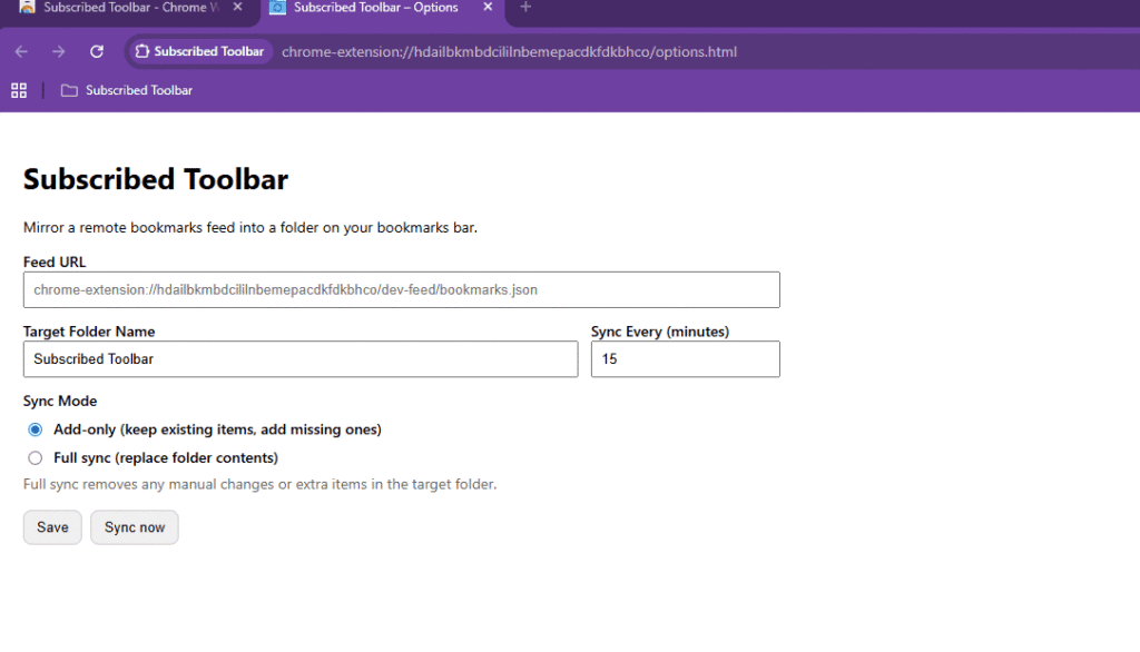 - Every time the JSON feed is updated, the extension can keep your chosen bookmark folder in sync.